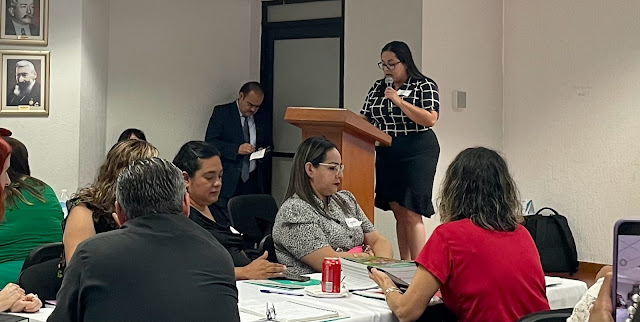 La Subsecretaria reconoció el apoyo de los representantes del Sindicato Nación de Trabajadores de la Educación de ambas secciones del estado (21 y 50). Invitó a la manipulación del material físico, aunque los asistentes ya se habían adelantado un poco para esta acción. Después, señaló la entrega de materiales con las preguntas detonadoras como apoyo.